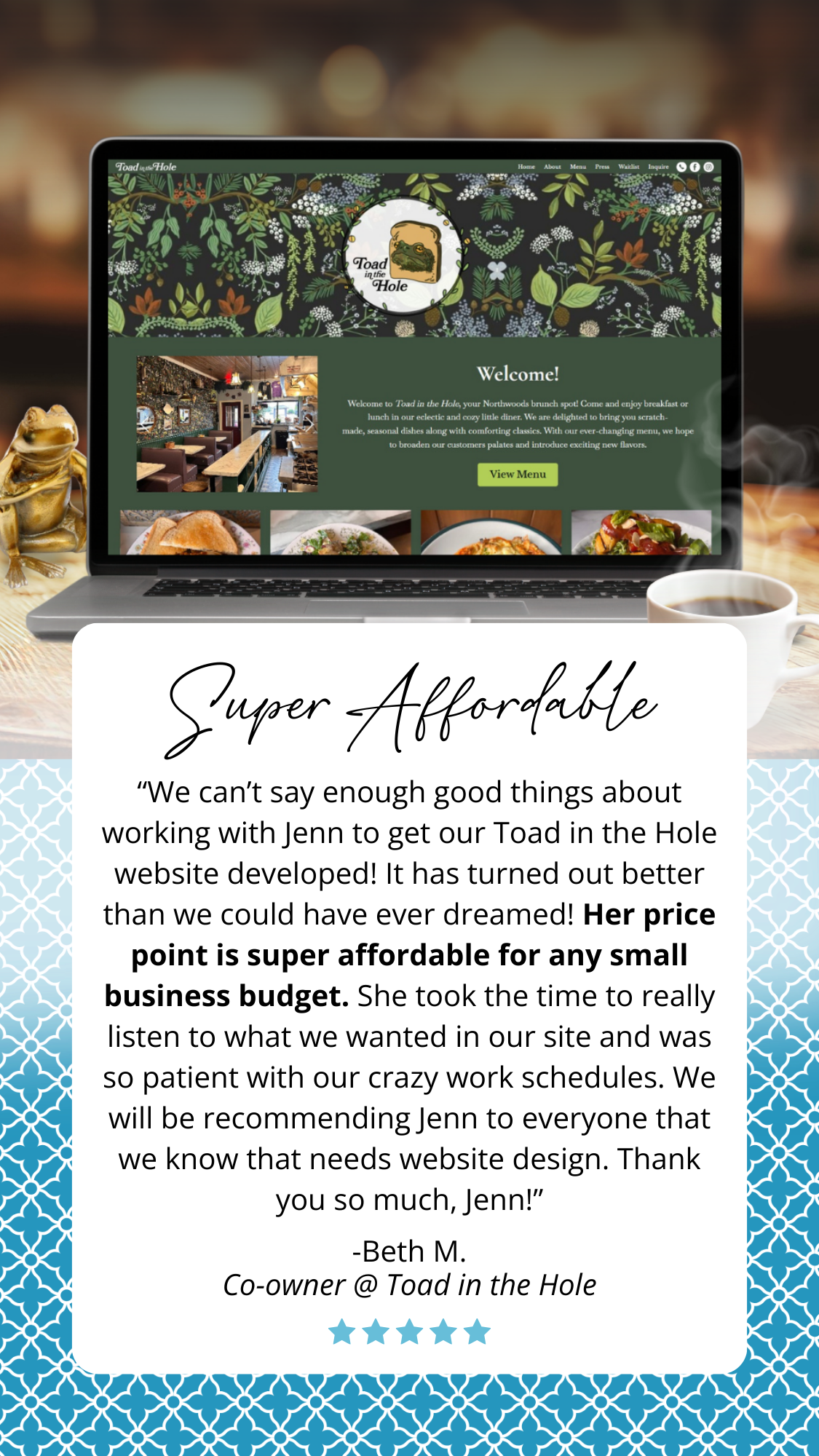 I enjoy working with all my clients, whether that is creating a website or whipping up a blog post for a small business or designing wedding invites for an excited bride. I take pride in my work and the ability to think outside the box to bring the designs to life!